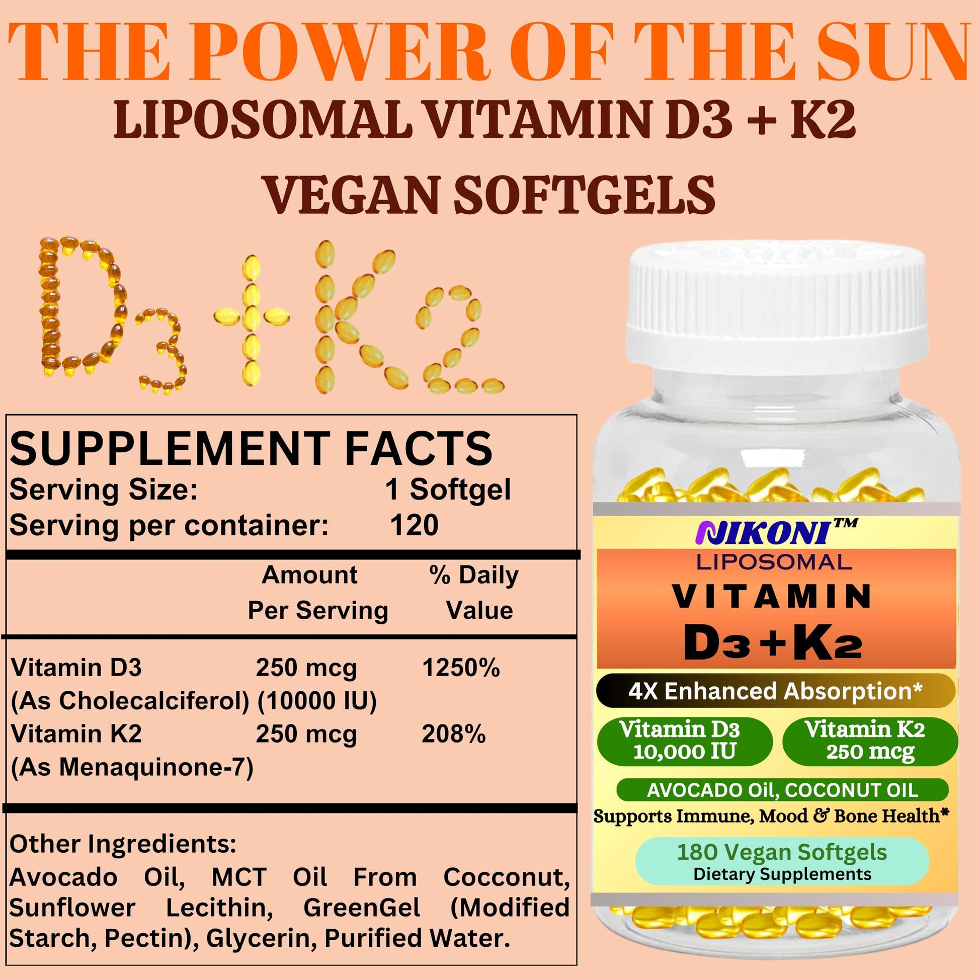 Nikoni Liposomal Vitamin D3 10000 IU, Vitamin K2 250 mcg, Vegan Softgels Supports Bone Health